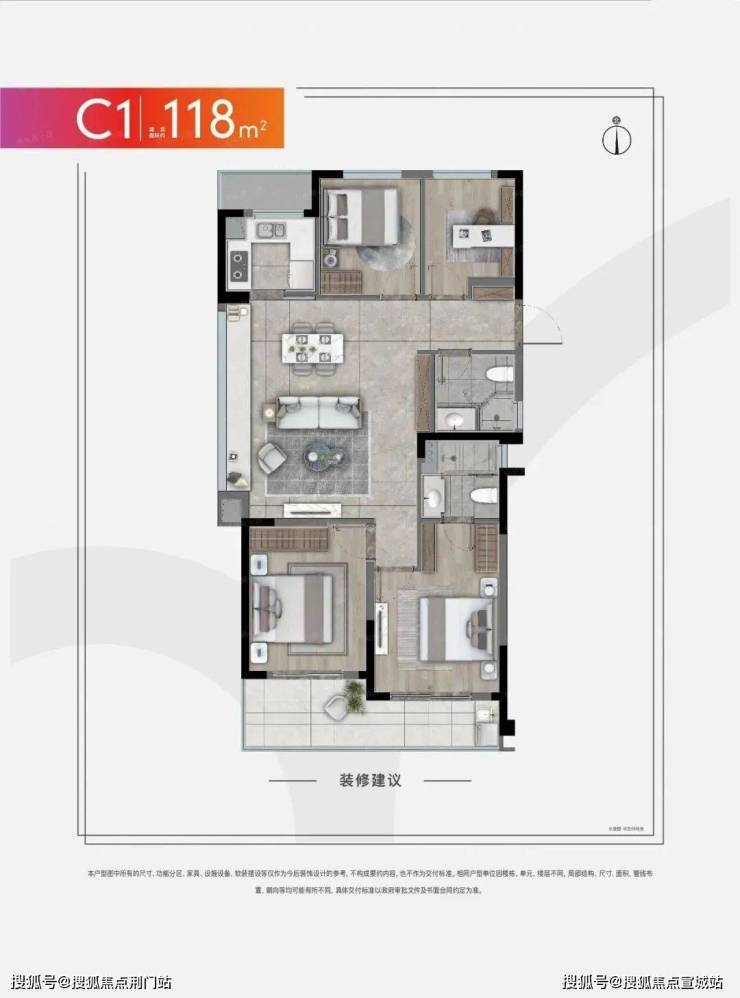 而建面约118㎡的产品即为四房两厅两卫的格式,南向双开间,双阳台相连也供给了更多的活动空间。两房朝南,差异于建面约98方户型,该户型的阳台有惊喜,是L型的。且北面多了一个房间,合适人口多的家庭。