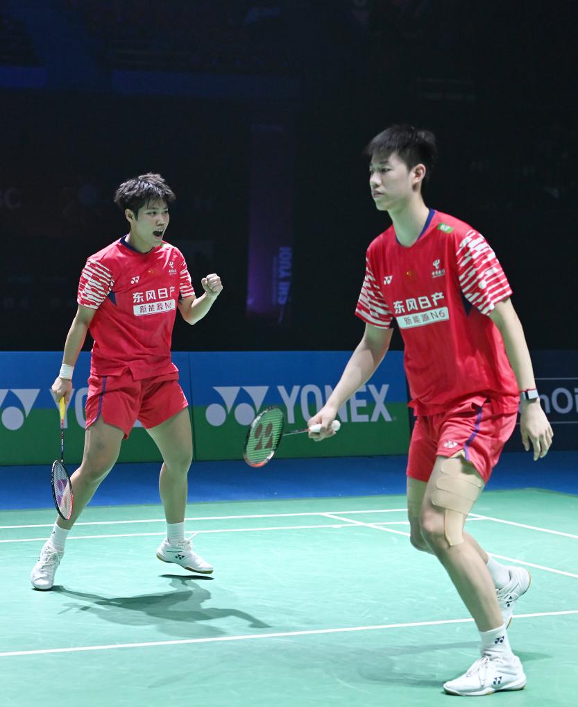 1月17日,冯彦哲/黄东萍(左)在竞赛中庆祝得分。