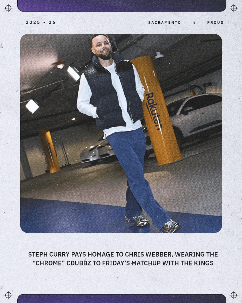 国王官方晒库里赛前进场照:斯蒂芬-库里穿戴国王名宿克里斯-韦伯曾在2002年NBA全明星赛中穿戴的个人专属银色Dada Supreme CDubbz“Chrome”步入大通中心球馆。